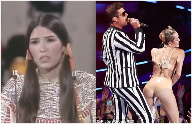 (Majtas: Aktivistja Sacheen Littlefeather, Djathtas: Perfomanca e Cyrus me Robie Thicke)