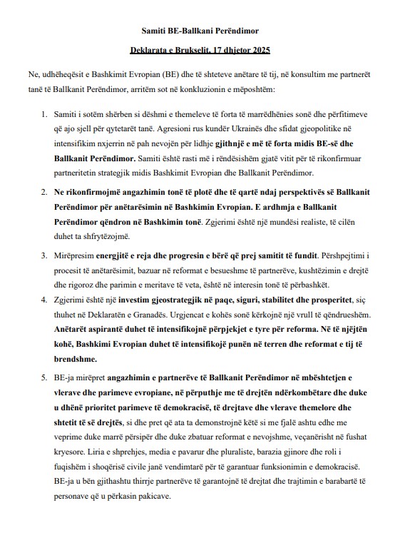 "E ardhmja e Ballkanit Perëndimor qëndron në Bashkimin tonë. Zgjerimi është një mundësi realiste, të cilën duhet ta shfrytëzojmë",- thuhet në deklaratë.