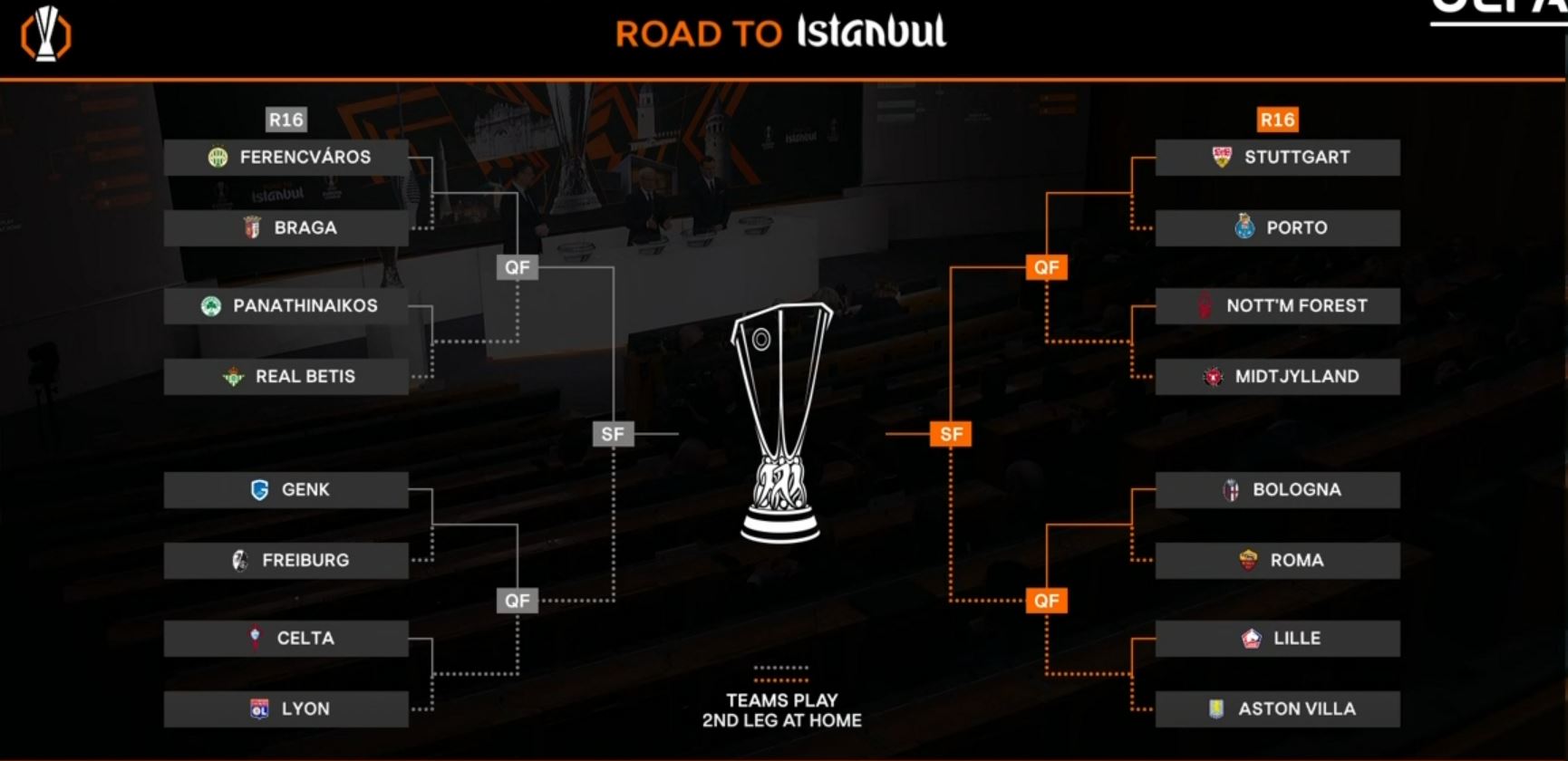 Goglat vendosën që në këtë fazë të kemi një përballje italiane, me Bolognan që gjeti Romën. Tjetër sfidë e fortë është ajo mes Lille dhe Aston Villas, apo ajo mes Stuttgartit dhe Portos. Lyoni do përballet me spanjollët e Celta Vigos, ndërsa Nottingham nuk do e ketë të lehtë kundër surprizës Midtjylland.