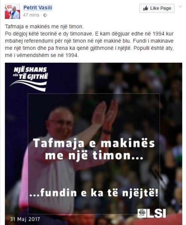 Vasili për t’i kthyer përgjigje PS kujton referendumin e vitit 1994 për Kushtetutën. “Tafmaja e makinës me një timon.
