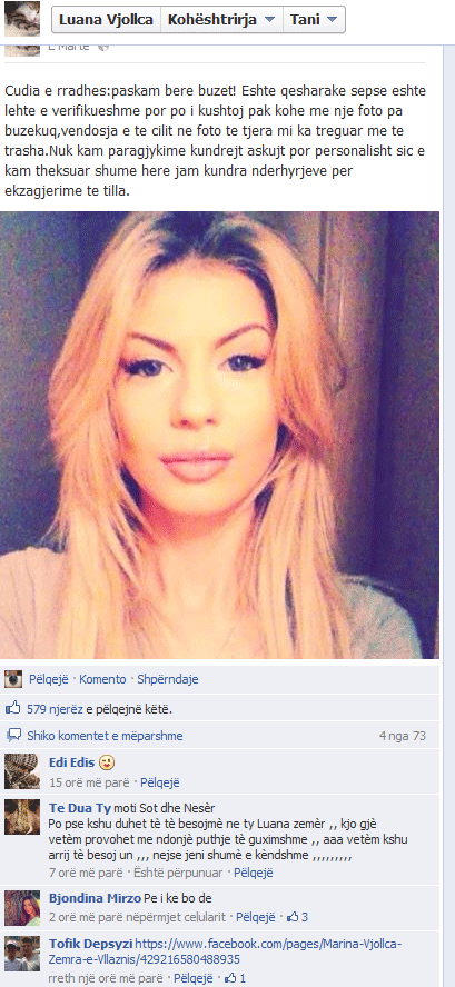 Më tej Luana ka shkruar:- “Çudia e rradhes:paskam bere buzet! Është qesharake sepse është lehtë e verifikueshme por po i kushtoj pak kohë me një foto pa buzëkuq,vendosja e të cilit në foto të tjera mi ka treguar më të trasha.Nuk kam paragjykime kundrejt askujt por personalisht siç e kam theksuar shume herë jam kundra ndërhyrjeve për ekzagjerime te tilla”.