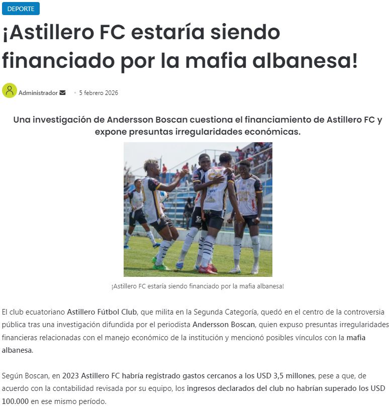 EKUADOR, Guayaquil - Klubi ekuadorian i futbollit me bazë në Guayaquil, kryeqytetin e Ekuadorit, Astillero Futbol Club, i cili luan në Kategorinë e Tretë, ishte në qendër të polemikave publike pas një hetimi të publikuar nga gazetari Andersson Boscan, i cili zbuloi parregullsi të dyshuara financiare në lidhje me menaxhimin ekonomik të institucionit dhe përmendi lidhje të mundshme me mafian shqiptare.
