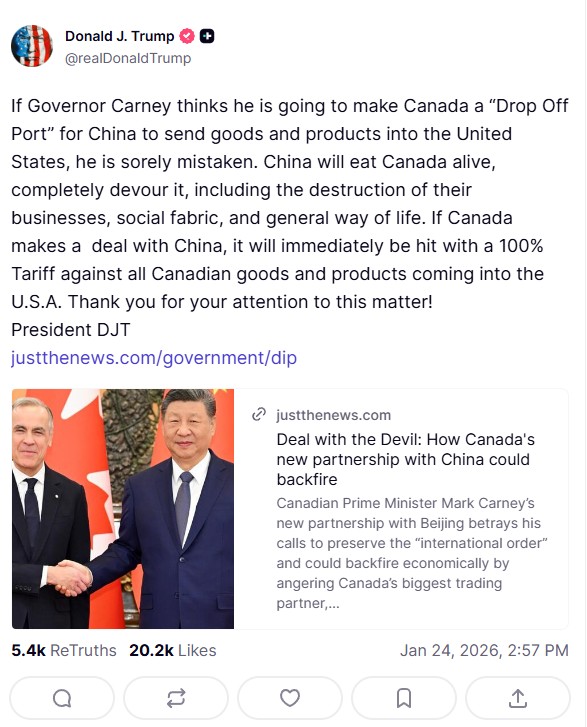 “Kina do ta hajë Kanadanë të gjallë, do ta shqyejë, përfshirë shkatërrimin e bizneseve, shoqëisë dhe jetesës së përditshme. Nëse Kanadaja bën një marrëveshje me Kinën, ajo do të goditet menjëherë me një tarifë doganore 100% për të gjitha mallrat dhe produktet kanadeze që hyjnë në SHBA,” shkroi Trump të shtunën në Truth Social.