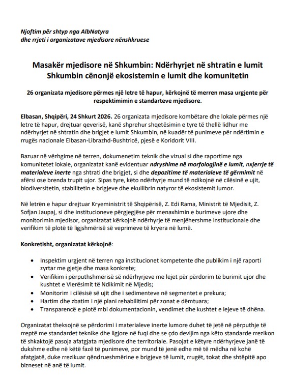 “Ne, organizatat e shoqërisë civile dhe grupet lokale nënshkruese, të angazhuara në mbrojtjen e mjedisit dhe interesit publik, paraqesim këtë letër të hapur për të kërkuar marrjen e masave urgjente institucionale, verifikim të ligjshmërisë dhe masa konkrete lidhur me ndërhyrjet e konstatuara në Lumin Shkumbin dhe brigjet e tij, veçanërisht në kontekstin e punimeve për ndërtimin e rrugës nacionale Elbasan– Librazhd–Bushtricë, si pjesë e Koridorit VIII”, shkruhet në letër.