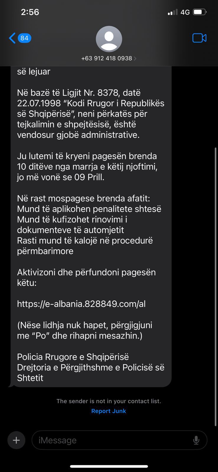 Mesazhet paraqiten në mënyrë të rreme si njoftime nga e-Albania për pagesën e gjobave të automjeteve dhe përmbajnë linqe të falsifikuara që drejtojnë përdoruesit në faqe të rreme, me qëllim përvetësimin e të dhënave personale dhe bankare.