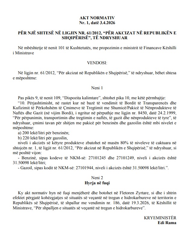 "Qeveria shqiptare sot ka ndërmarrë Aktin Normativ për të ulur akcizën, si rrjedhojë e rritjes së çmimit të naftës në tregjet ndërkombëtare, sidomos në 48 orët e fundit. Ky Akt Normativ parashikon uljen e akcizës me 20%, nëse rast se çmimi i shitjes me pakicë, i përcaktuar nga Bordi i Transparencës do të jetë: