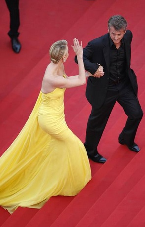 E veshur me  një fustan elegant të verdhë dhe e shoqëruar nga partneri i saj aktori Sean Penn.