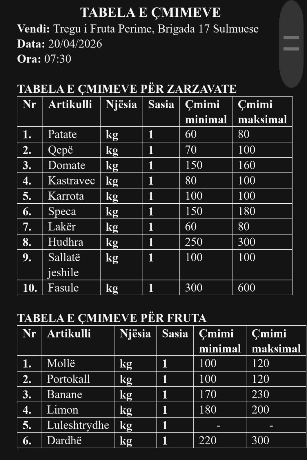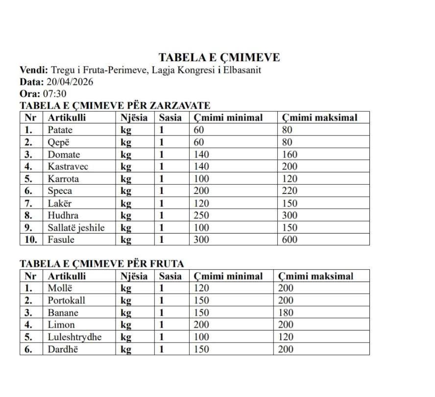 Tabelat e publikuara më poshtë pasqyrojnë çmimet e verifikuara gjatë orëve të para të mëngjesit të sotëm në disa prej tregjeve kryesore të qytetit të Elbasanit.