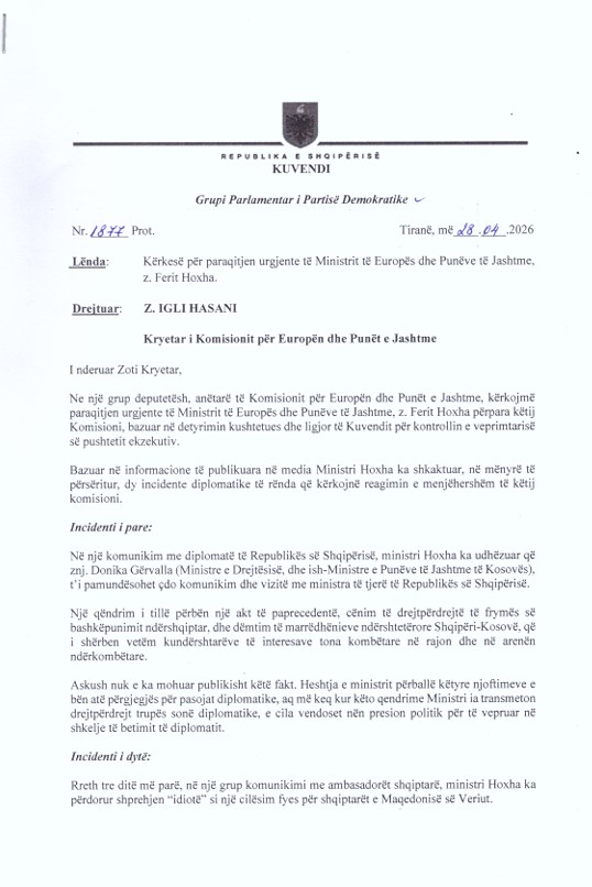 Kësaj radhe, denmokratët kërkojnë seancë urgjente me ministrin Hoxha në në Komisionin e Jashtëm, për t’iu përgjigjur akuzave. Gjithashtu, shpjegime deputetët opozitarë kërkojnë edhe për pretendimet se kreu i diplomacisë shqiptare ka dhënë një udhëzim që ministres së Drejtësisë së Kosovës, Donika Gërvalla, t’i pamundësohet çdo komunikim dhe vizitë me ministra të tjerë të Shqipërisë.