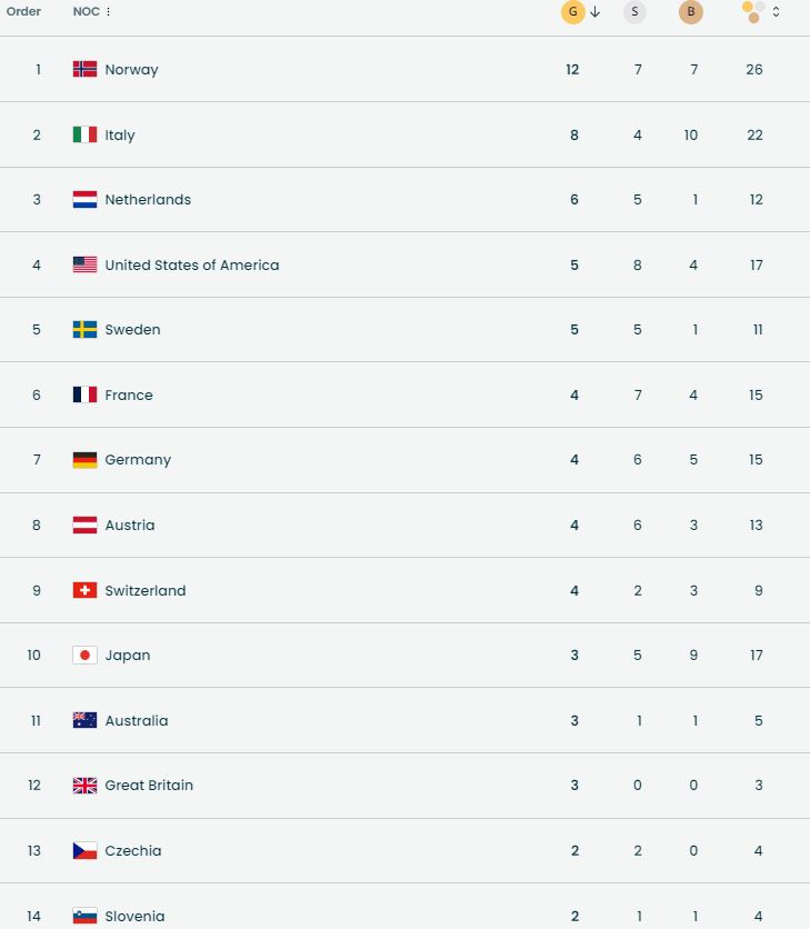 Deri në këto momente është Norvegjia me 12 medalje të arta dhe 26 në total që kryeson listën e çmimeve. Pas tyre Italia, Holanda dhe më pas SHBA-të dhe Suedia.