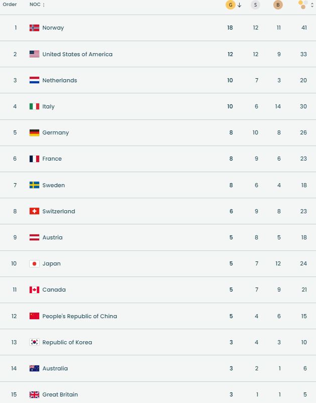 Me 18 medalje të arta, 12 të argjendta dhe 11 të bronzta, Norvegjia dominoi renditjen e përgjithshme (41 medalje), duke vendosur edhe rekord të ri olimpik për numrin e medaljeve të arta në një edicion të Lojërave Dimërore. Kjo është hera e katërt radhazi që norvegjezët kryesojnë tabelën e medaljeve.