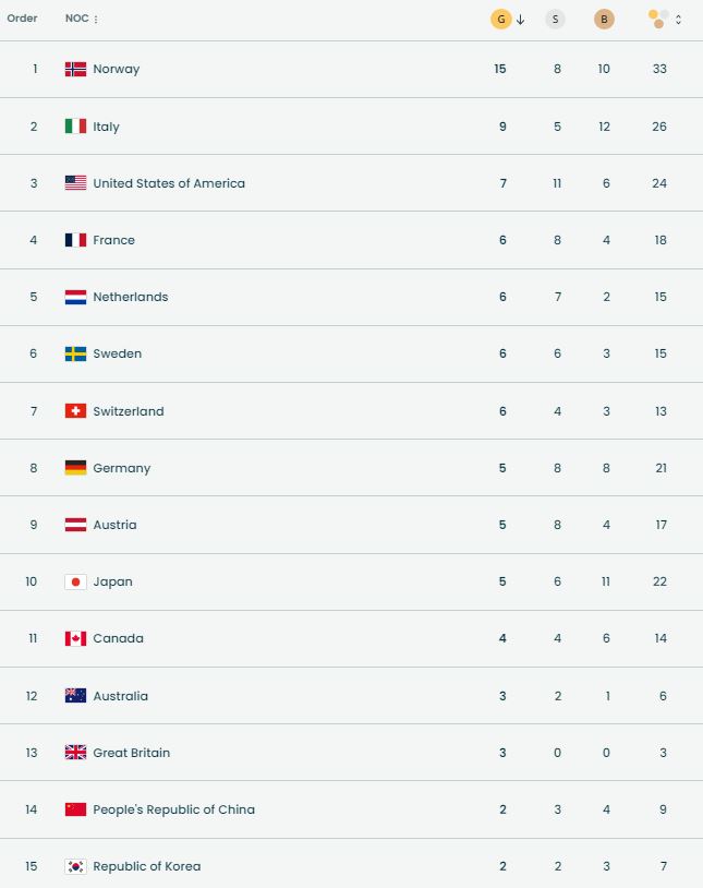 Renditja e medaljeve deri mesditën e datës 19 shkurt