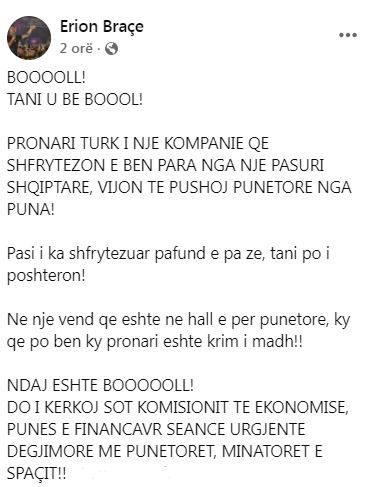 Në një postim në Facebook, Braçe thotë se do t’i kërkoj sot Komisionit të Ekonomisë, seancë urgjente dëgjimore me punëtorët, minatorët e Spaçit.