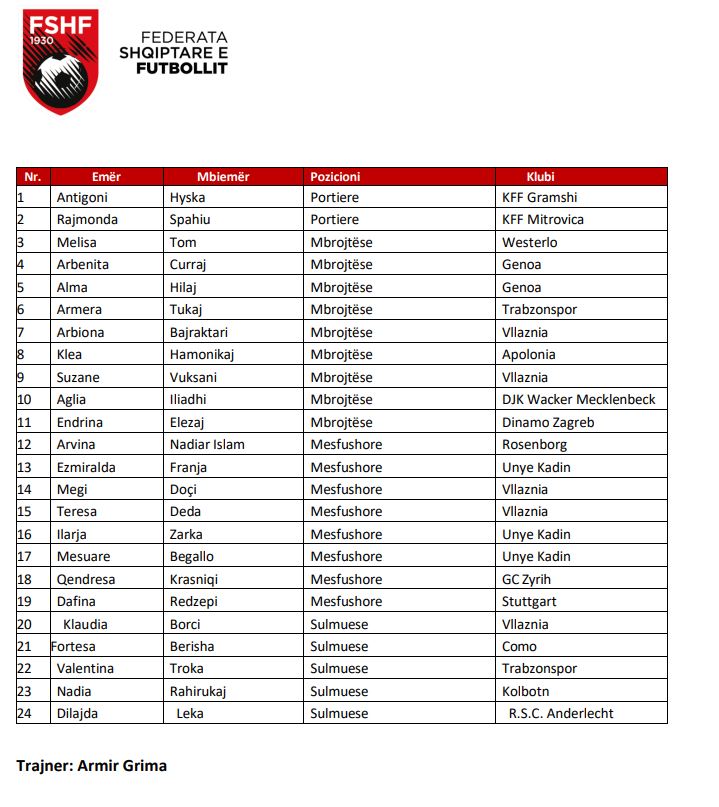 Në kuadër të këtyre dy miqësoreve, trajneri Grima ka grumbulluar 24 futbolliste, pesë prej të cilave janë risi në listën kuqezi.