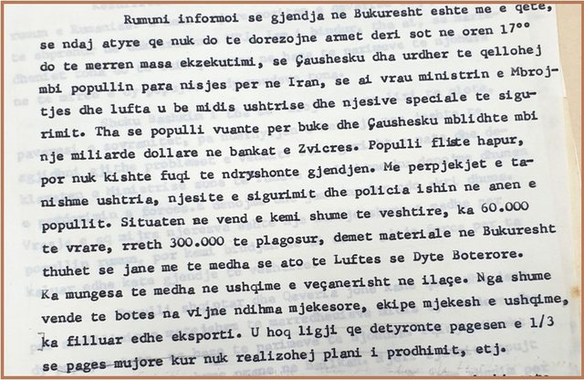 Retrospektivë, dhjetor 1989. Në Rumani vritet Çaushesku. Tirana zyrtare kërkon ambasadorin për tu informuar. Teksti i thotë të gjitha, – një mesazh që më shumë sesa për Rumaninë, vlen për Tiranën.