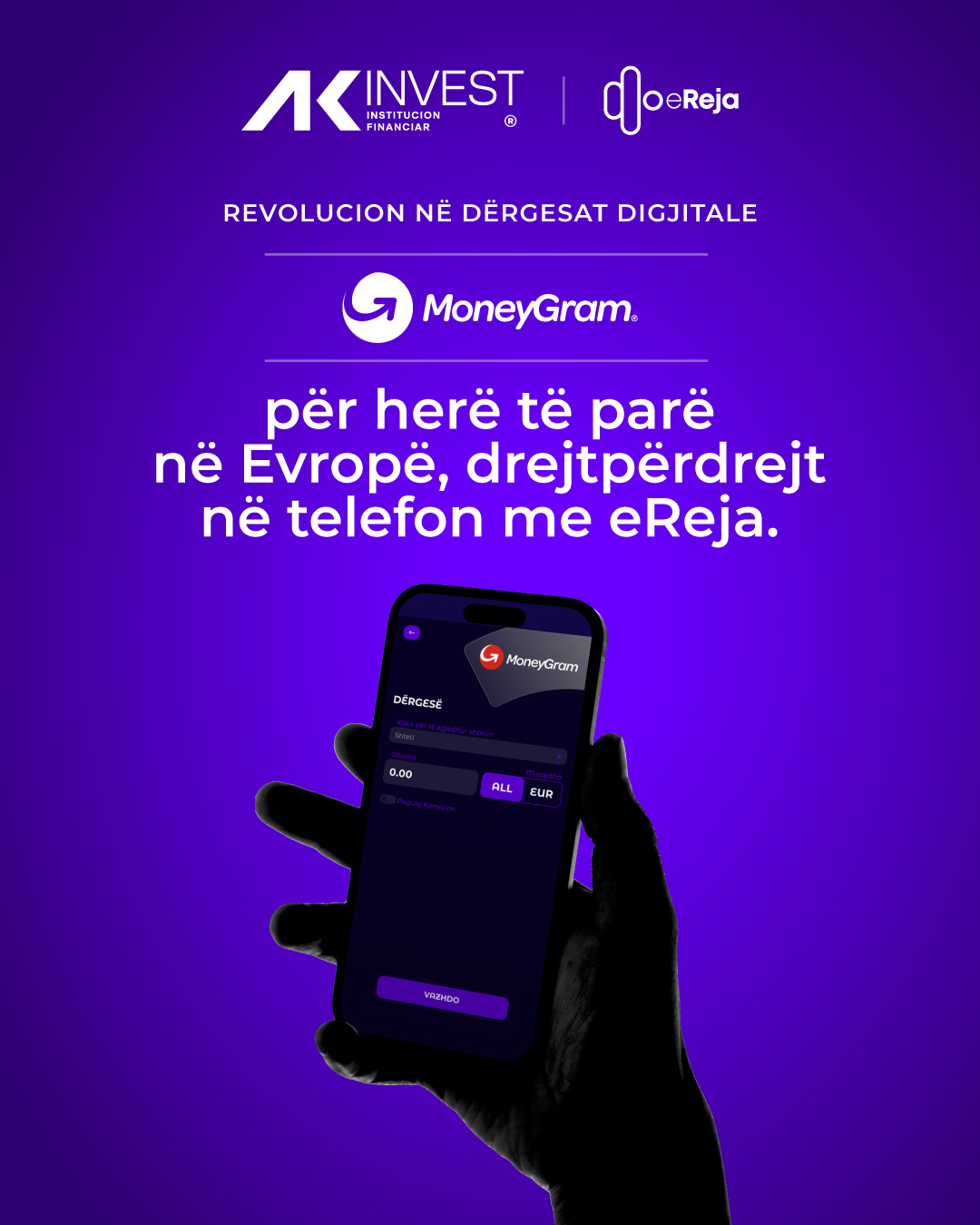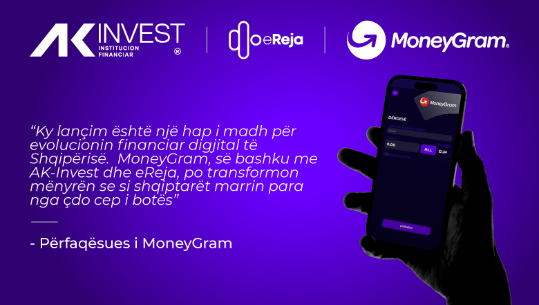 MoneyGram, një rrjet global lider i pagesave për klientët, bizneset dhe komunitetet, ka lançuar një shërbim të ri ndërkombëtar të dërgesave të parave digjitale për Shqipërinë në bashkëpunim me partnerin e tij afatgjatë, AK-Invest institucion financiar me kapital tërësisht Shqiptar i konsoliduar që ofron shërbime financiare për klientët e tij në treg prej shumë vitesh, dhe eReja Institucion i Parasë Elektronike, mbështetur nga përvoja e gjatë e AK-Invest, i cili mundëson shërbime financiare plotësisht digjitale.