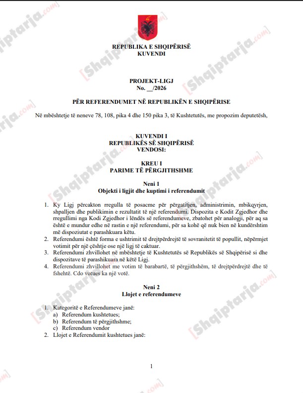 Në dokumentin për të cilin socialistët thonë se kanë punuar 2 muajt e fundit parashikohen tre lloje referendumesh: ai kushtetues që kërkon që populli të thotë fjalën e fundit për ndryshimin e Kushtetutës, referendumi i përgjithshëm që ka të bëjë me shfuqizim ligjesh apo çështje të një rëndësie të veçantë, apo edhe referendum vendor që ka të bëjë me pushtetin lokal, për vendimmarrje në bashki të ndryshme.