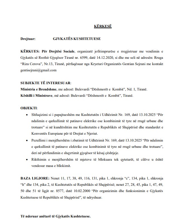 Organizata "Drejtësi Sociale" ka dorëzuar në Gjykatën Kushtetuese padinë për shfuqizimin e udhëzimit të ish-ministres së brendshme (tani zv/kryeministre), Albana Koçiut për për ndalimin për qarkullim të monopatinave elektrike.