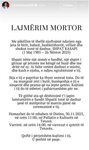 “Me pikëllim të thellë njoftojmë ndarjen nga jeta të birit, babait, bashkëshortit, vëllait dhe shokut tonë të dashur, SHPAT KASAPI. Ikja e tij e papritur ka thyer zemrat tona. Do të na mungojë zëri i butë, buzëqeshja e tij e sinqertë dhe prania që na jepte qetësi. Kujtimi i tij do të mbetet i paharrueshëm për ne.”