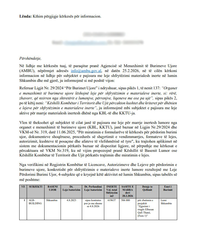 “Subjektet dërgojnë informacion pranë ZABL-ve përkatëse mbi sasisë e materialeve inerte të shfrytëzuar dhe në fund të çdo viti realizohet rakordimi me ARRSH-në mbi sasitë e inerteve në preventivat përkatës”, thuhet në përgjigje.