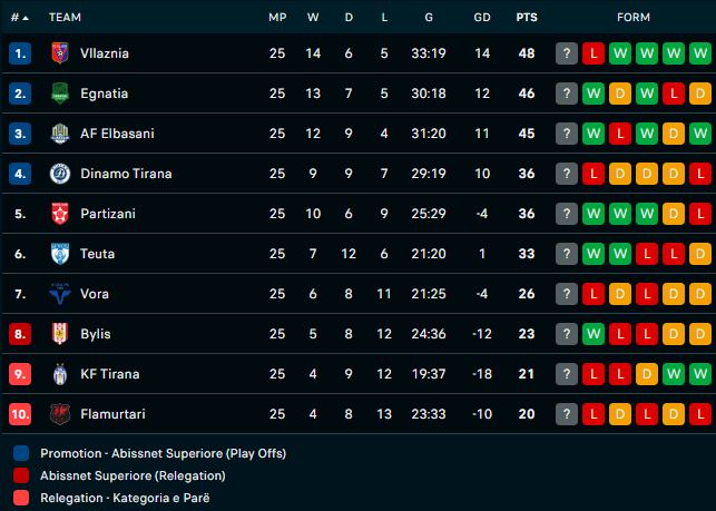 Pas 25 ndeshjeve të luajtura këtë sezon, Vllaznia me 48 pikë mban vendin e parë, ndërsa Tirana me vetëm 21 pikë mbetet në pozitën e parafundit.