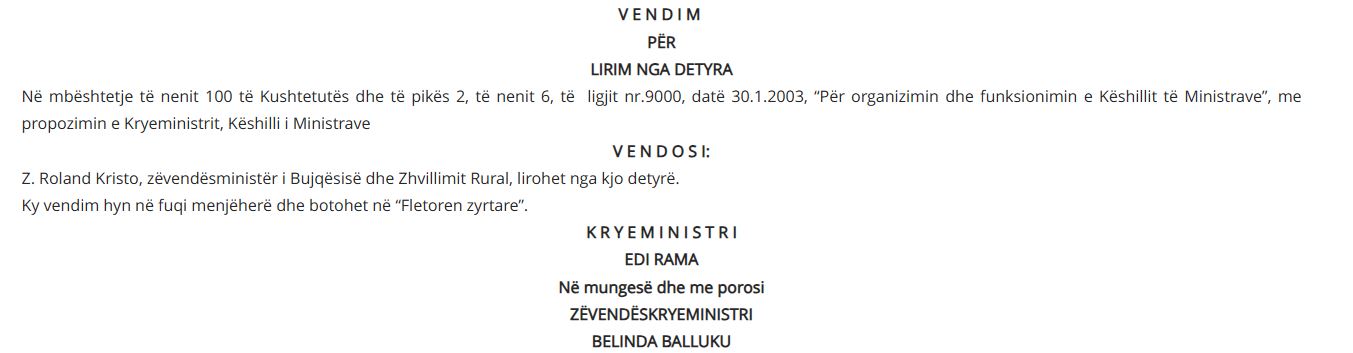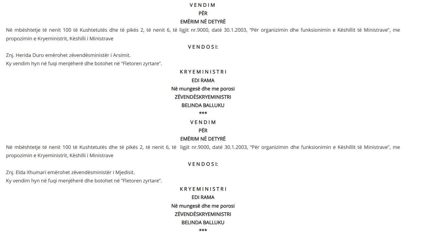 Gjithashtu, Elda Xhumari është emëruar zëvendësministre e Mjedisit. Ndërsa, zv.ministri i Bujqsisë Roland Kristo është lriuara nga kjo detyrë.
