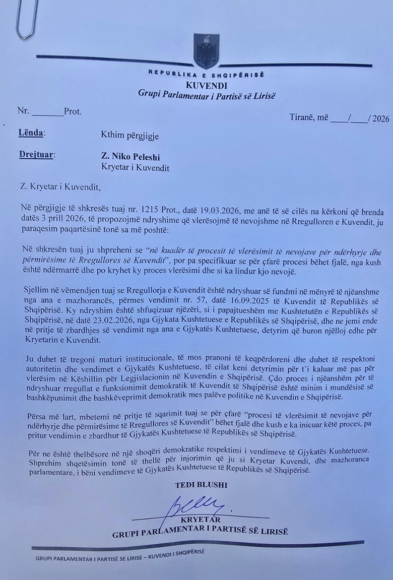 Kreu i grupit parlamentar të Partisë së Lirisë, Tedi Blushi, i është përgjigjur kërkesës së kryetarit të parlamentit, Niko Peleshit, për propozimet e ndryshimeve në Rregulloren e Kuvendit brenda datës 3 prill 2026.