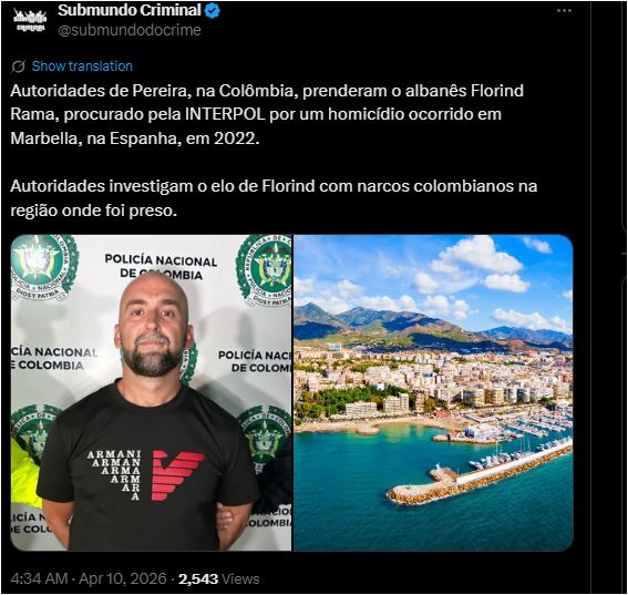 Një shqiptar është arrestuar në Pereira të Kolumbisë pasi ishte në kërkim për një vrasje të ndodhur në Marbella të Spanjës në vitin 2022.