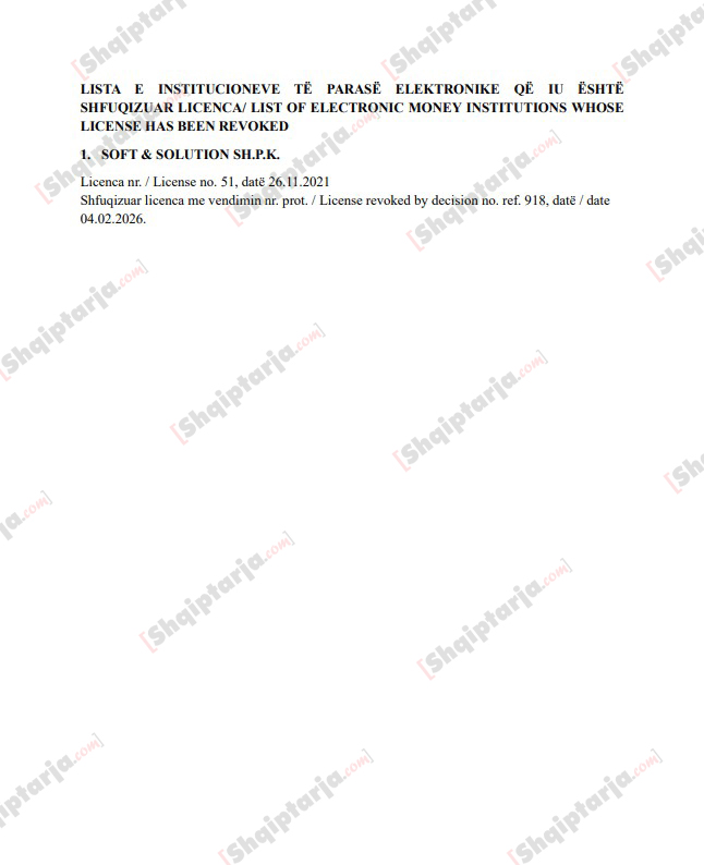 Banka e Shqipërisë ka vendosur t’i shfuqizojë licencën institucionit financiar të parasë elektronike, Soft & Solution në pronësi të biznesmenit Ermal Beqiri, i shpallur në kërkim nga SPAK në kuadër të hetimeve për AKSHI-n.
