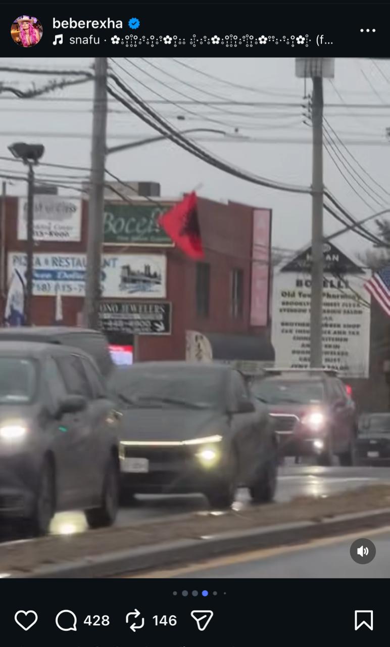 Teksa po bënte një xhiro me makinë, këngëtarja ka filmuar një rrugë të tërë të ‘veshur’ me flamuj kuq e zi, të cilët valviten krah flamujve amerikanë.