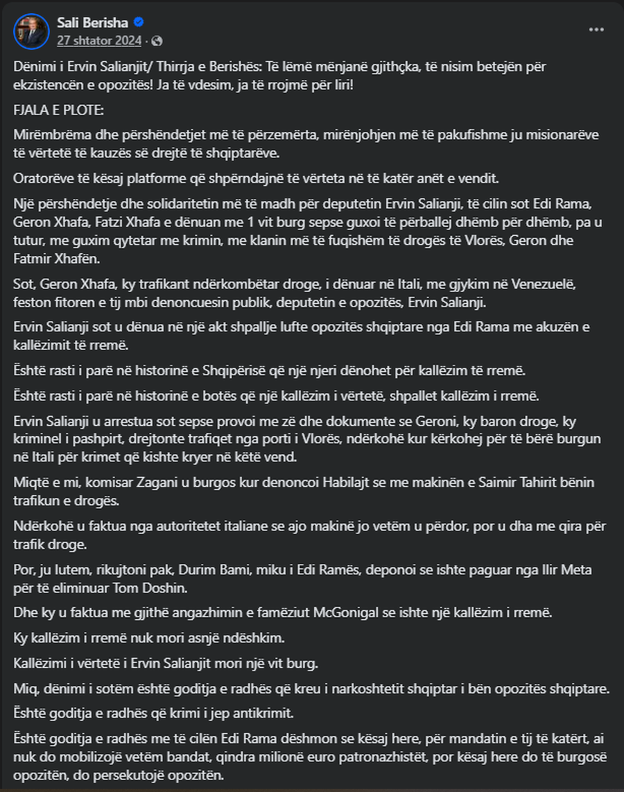 “Një përshëndetje të përzemërt t’i dërgojmë ne deputetit, Ervin Salianjit. Që është sot qytetari i vetëm i Europës i burgosur, sepse guxoi të denoncojë vëllain trafikant të kriminelit Fatmir Xhafa, Geron Xhafën. Ky akt dëshmon edhe njëherë, se Edi Rama është bir besnik i xhelatit Kristaq Rama, dhe se Edi Rama do një Shqipëri pa opozitë, njëlloj si i ati që si xhelat firmoste ekzekutime dhe varje të kundërshtarëve politikë”, shkruante Berisha.