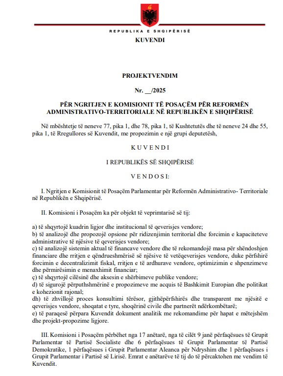 “III. Komisioni i Posaçëm përbëhet nga 17 anëtarë, nga të cilët 9 janë përfaqësues të Grupit Parlamentar të Partisë Socialiste dhe 6 përfaqësues të Grupit Parlamentar të Partisë Demokratike, 1 përfaqësues i Grupit Parlamentar Aleanca për Ndryshim dhe 1 përfaqësues i Grupit Parlamentar i Partisë së Lirisë. Emrat e anëtarëve të tij do të përcaktohen me vendim të Kuvendit.