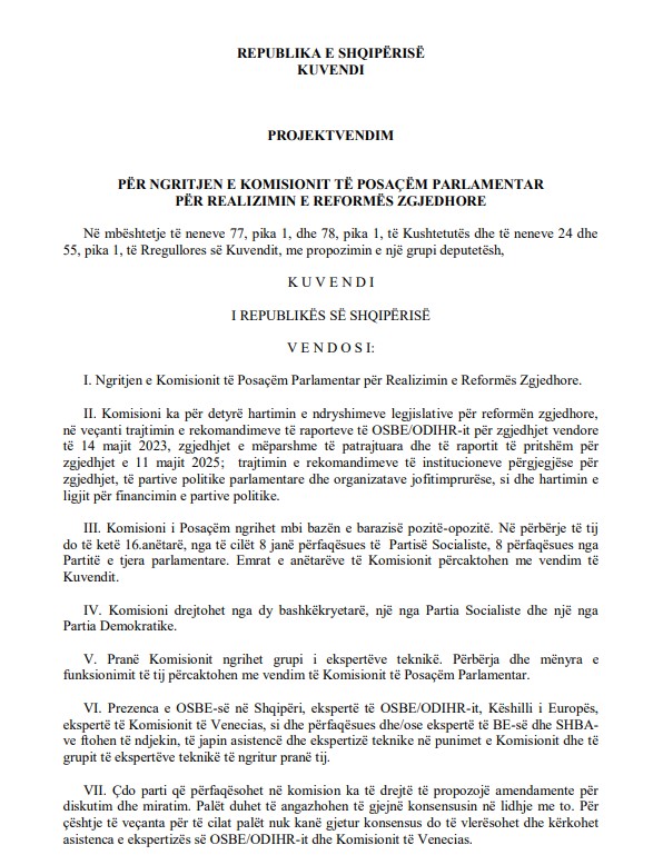 Komisioni për Reformën Zgjedhore do të ngrihet në barazi opozitë-mazhoranvë. Në total komisioni do të ketë 16 anëtarë, 8 nga Partia Socialiste dhe 8 nga partitë e tjera opozitare. Komisioni do të drejtohet nga dy bashkëkryetarë një nga Partia Socialiste dhe një nga Partia Demokratike.