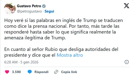 Në një postim të gjatë në rrjetin social X, Petro i është drejtuar Trump dhe Sekretarit amerikan të Shtetit, Marco Rubio, duke u kërkuar atyre të ndalojnë, sipas tij, shpifjet ndaj figurës së tij publike.