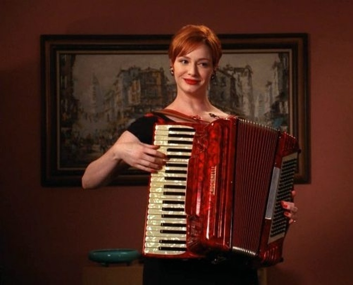 4. Christina Hendricks, si personazhi i saj në Mad Men, mund të luajë vërtet fizarmonikën