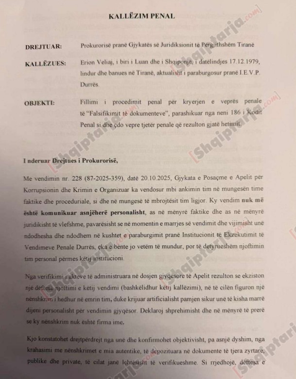 Por Veliaj thotë në kallëzim, se ky nënshkrim nuk është firma e tij, ndërsa shton se ka kërkuar informacion edhe nga Burgu i Durrësit, i cili i ka komunikuar një se vendimi i Apelit nuk ka mbërritur asnjëherë në burgun ku Veliaj ndodhet i paraburgosur.