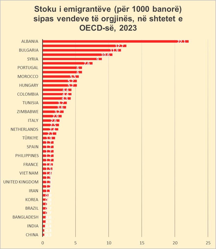 Sipas vlerësimeve të Organizatës për Bashkëpunim Ekonomik dhe Zhvillim (OECD), për çdo një mijë banorë në Shqipëri 22.1 ishin emigrantë në 38 vendet OECD, një tregues që e vendos Shqipërinë shumë përpara vendeve të tjera si Rumania si vendi i dytë me 12.7 emigrante për 1000 banorë, Bullgaria (11.9) apo Kuba (10.6) (shiko grafikun e mëposhtëm).