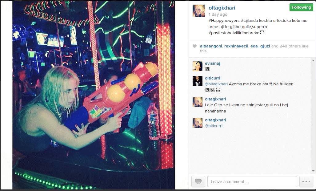 Olta është befasuar nga festimet në Tajlandë ku njerëzit shfaqen duke fetuar me mbathje dhe ka shkruar:- “Happy neë year, këtu u festoka me armë uji, të gjithë qullë, superr”.