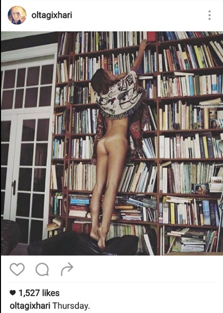 Në foton e publikuar nga aktorja, është një vajzë pothuajse e zhveshur e cila po nxjerr nga biblioteka e madhe një libër.