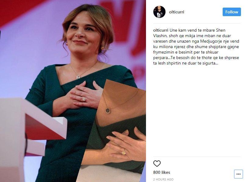 "Une kam vend te mbare Shen Vlashin, shoh qe mikja ime mban ne duar varesen dhe unazen nga Medjugorje nje vend ku miliona njerez dhe shume shqiptare gjejne frymezimin e besimit per te shkuar perpara...Te besosh do te thote qe ke shprese ta lesh shpirtin ne duar te sigurta...", shkruan blogeri Curri.