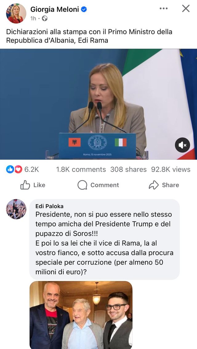 Nën postimin zyrtar të kryeministres italiane Giorgia Meloni në Facebook, ku ajo njoftonte deklaratat për shtyp me kryeministrin e Shqipërisë, Edi Rama, deputeti demokrat Edi Paloka ka lënë një koment ku i “raporton” Melonit për akuzat ndaj qeverisë së Tiranës.