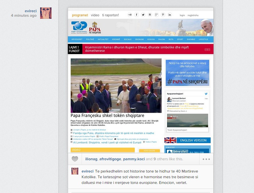 (Postimi i këngëtares Evi Reçi për vizitën e Papës në Tiranë)