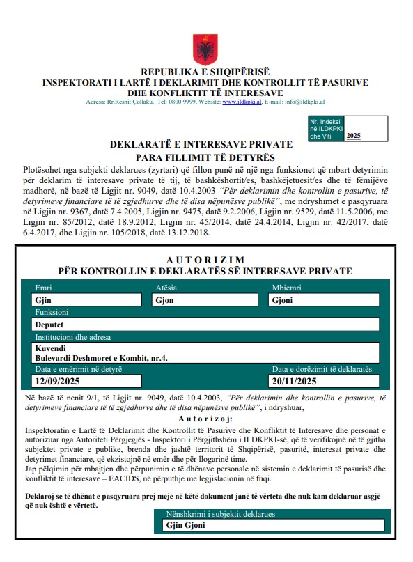 Gjin Gjoni e dha dorëheqjen në përfundim të lejes dyvjeçare prindërore që mori nga ish-KLD-ja në vitin 2018, ku ishte anëtar edhe vetë, ndërsa Ilir Meta ishte kryetar.