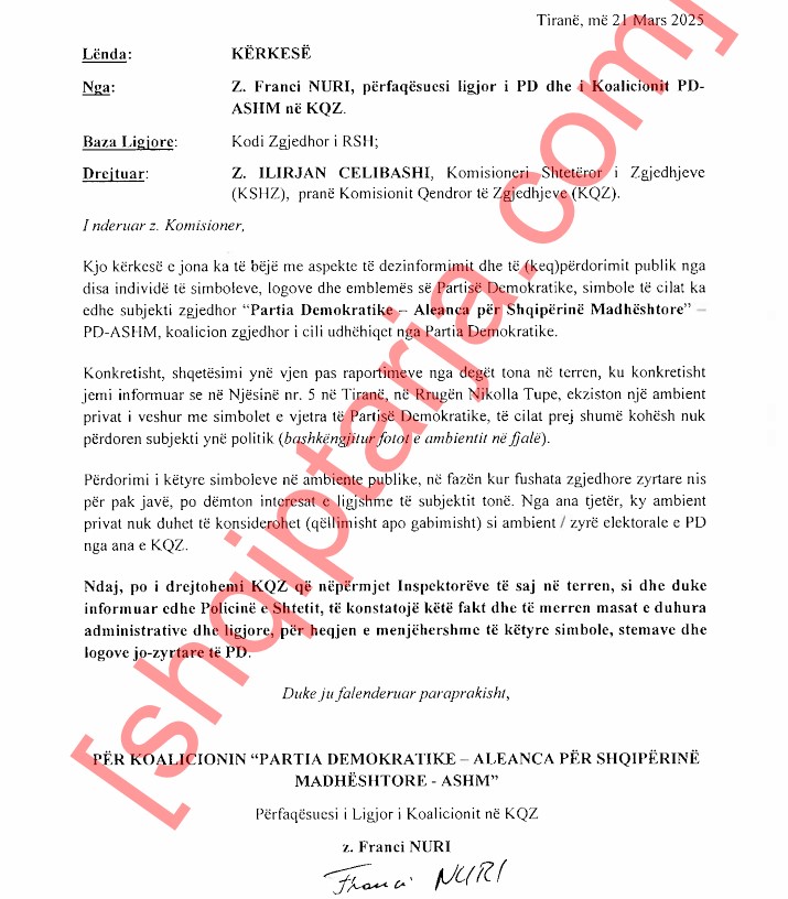 Kërkesa është depozituar nga Franc Nuri, përfaqësues ligjor i PD-së, më 21 mars, në Komisionin Qëndror të Zgjedhjeve, drejtuar kryekomisionerit Ilirjan Celibashi, si dhe Policisë së Shtetit.