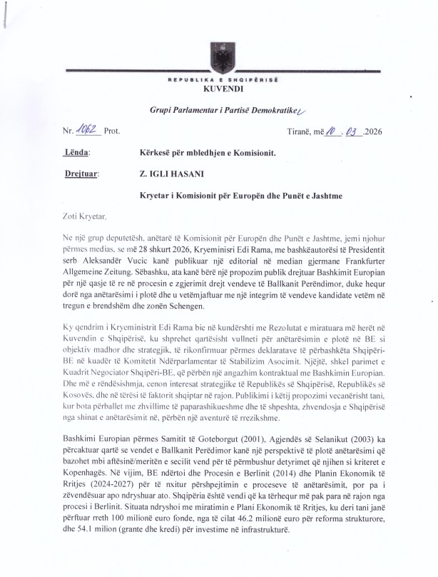 "Ky qendrim i Kryeministrit Edi Rama bie në kundërshti me Rezolutat e miratuara më herët në Kuvendin e Shqipërisë, ku shprehet qartësisht vullneti për anëtarësimin e plotë në BE si objektiv madhor dhe strategjik, të rikonfirmuar përmes deklaratave të përbashkëta ShqipëriBE në kuadër të Komitetit Ndërparlamentar të Stabilizim Asocimit. Njëjtë, shkel parimet e Kuadrit Negociator Shqipëri-BE, që përbën një angazhim kontraktual me Bashkimin Europian. Dhe më e rëndësishmja, cenon interesat strategjike të Republikës së Shqipërisë, Republikës së Kosovës, dhe në tërësi të faktorit shqiptar në rajon. Publikimi i këtij propozimi vecanërisht tani, kur bota përballet me zhvillime të paparashikueshme dhe të shpeshta, zhvendosja e Shqipërisë nga shinat e anëtarësimit në, përbën një aventurë të rrezikshme", thuhet në kërkesë.