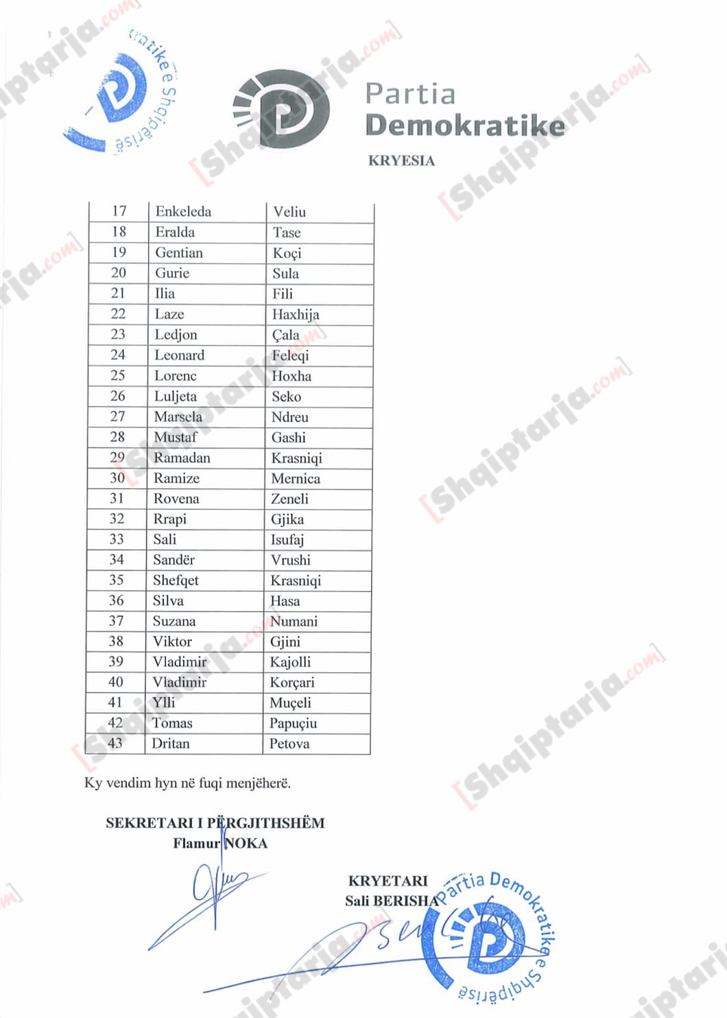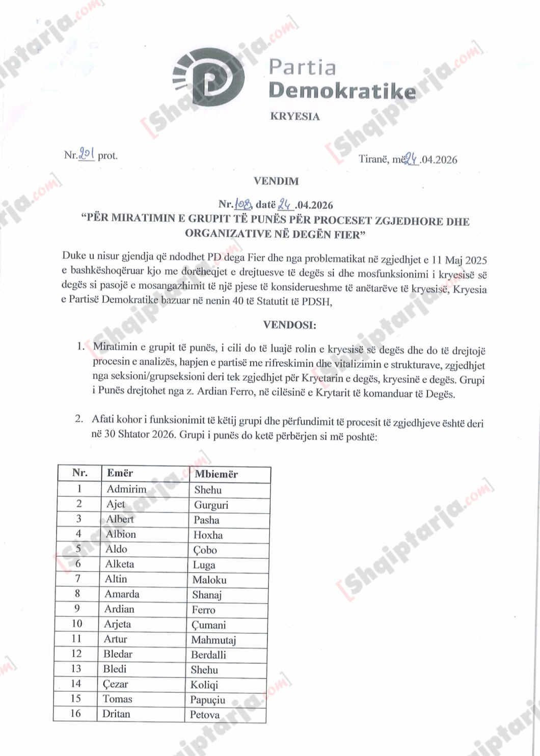 43 emrat që do të drejtojnë përkohësisht PD-në në Fier janë: