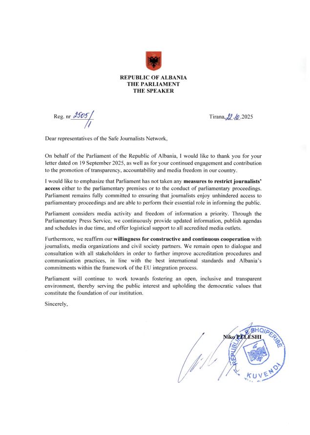 Kuvendi i Shqipërisë i është përgjigjur letrës së dërguar më 19 shtator nga Safe Journalist lidhur me raportimet se do të ketë kufizime për gazetarët dhe mediat në Kuvend. Kryetari Niko Peleshi thotë se institucioni nuk ka ndërmarrë asnjë masë që kufizon qasjen e mediave në punimet parlamentare.