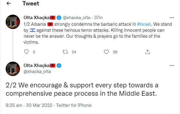 “Shqipëria dënon ashpër sulmin barbar në Izrael. Ne qëndrojmë pranë Izraelit kundër sulmeve të tmerrshme terroriste. Vrasja e njerëzve të pafajshëm të jetë një zgjidhje tjetër. Mendimet dhe lutjet tona për familjet e viktimave. Ne inkurajojmë dhe mbështesim çdo hap drejt një procesi gjithëpërfshirës paqeje në Lindjen e Mesme.”, shkruan Xhaçka.