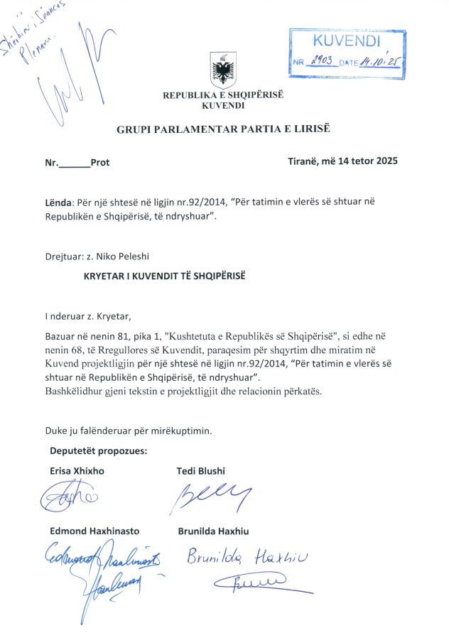 Duke sjellë në vëmendje se Shqipëria ka një prej TVSH-ve më të larta në rajon për ushqimet e shportës, deputetët e Partisë së Lirisë depozituan në Kuvend propozimin ligjor për ta ulur nga 20% në 5% Tatimin mbi Vlerën e Shtuar te ushqimet bazë.