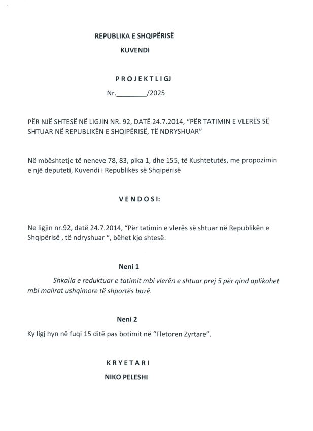 “Ulja e këtij tatimi në 5% për një listë të kufizuar dhe të përcaktuar qartë të produkteve të shportës, nuk është vetëm një masë ekonomike, por një akt social dhe moral, në funksion të: Qëllimi i këtij projektligji është ulja e barrës fiskale për qytetarët shqiptarë për mallrat ushqimore bazë, të njohura si “artikujt e shportës”. Aktualisht, këto mallra tatohen me normën standarde të TVSH-së prej 20%. Propozimi synon aplikimin e një shkalle të reduktuar prej 5%, në përputhje me praktikat më të mira europiane dhe për të rritur fuqinë blerëse të konsumatorëve, veçanërisht të shtresave në nevojë”, thuhet në kërkesën e PL-së që propozon ndryshim të ligjit.